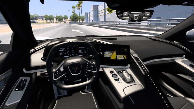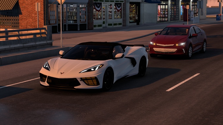 This is a Chevrolet Corvette C8 car mod for ATS 1.57. It features detailed interior and exterior textures, working animated parts (opened front windows, wipers), and customized dashboard. You can purchase it from the mod dealer.