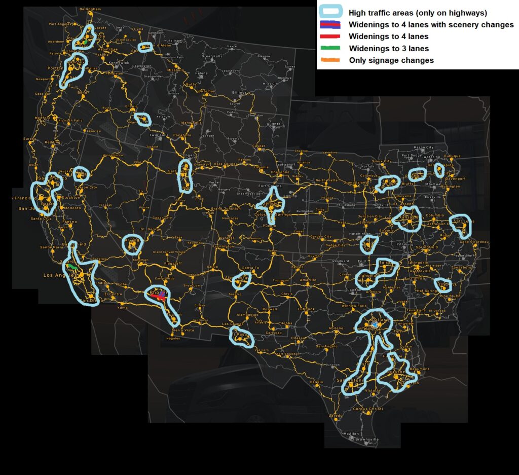 Urban Traffic Overhaul for ATS 1.58 significantly increases traffic density in major cities while keeping rural areas at vanilla levels. It also widens selected freeways and improves inaccurate urban areas for a more realistic experience. All map DLCs required, compatible with 1.58.x.