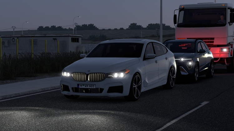 This mod adds the BMW 6-Series GT G32 car to ETS2 version 1.57. It features a custom dashboard, an opening front window, a mounting attachment for towing a small caravan-style trailer, and realistic engine and transmission settings. You can purchase it from the mod dealer.