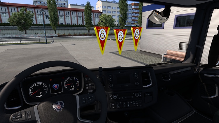 An accessory mod for ETS2 1.57 that adds a triangular Galatasaray Sports Club flag which can be attached to the truck’s windshield.