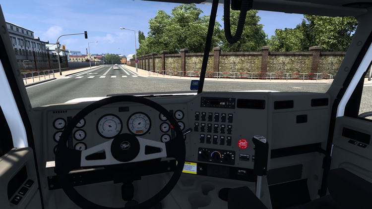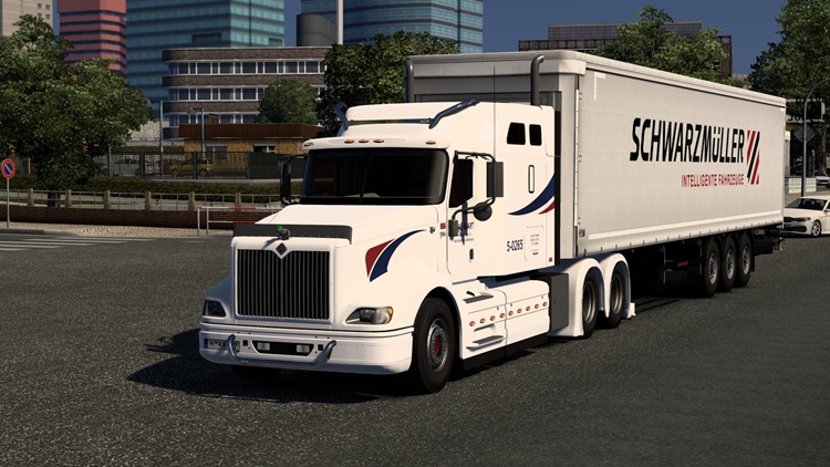 This is the International 9400I truck mod for ETS2 version 1.57. It includes a kangaroo cage, lightbar, double muffler, rear wing, and a fixed walkie-talkie. You can purchase it at the mod dealer.