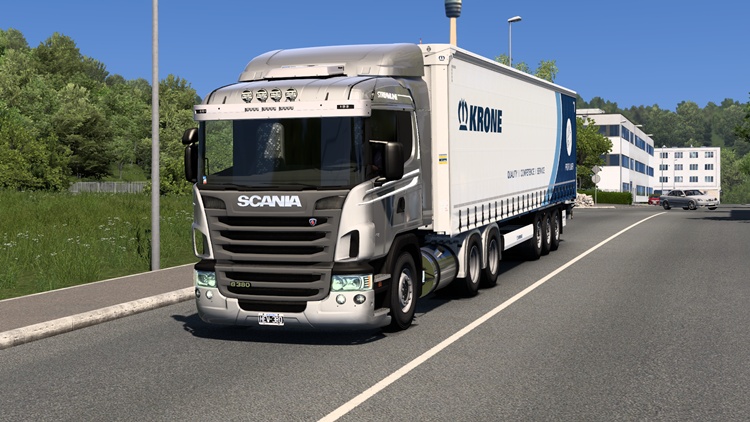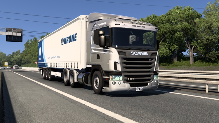 This is a Scania G-380 truck mod compatible with ETS2 version 1.57. It features 6×2 and 6×4 chassis options. The mod includes various exhaust designs, intercoolers, bumpers, antennas (Latin American style), and highly detailed customization options.