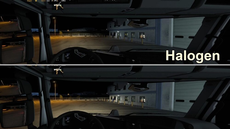 This mod adds a choice between halogen or LED/Xenon headlights for SCS trucks, improving low beam angle and increasing high beam range. Updated for ETS2 1.59.