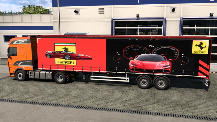 Ferrari Skin Mod for Standard Curtain Trailer in ETS2 1.58. This Ferrari-themed skin mod brings the iconic Rosso Corsa red and high-resolution textures to your trailer, giving it a true racing spirit.